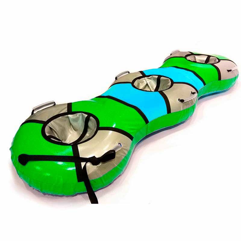 Тюбинг Snow Show тройной «Трио-Банан», предназначенный для катания втроем, изготовлен из высококачественной тентовой ПВХ ткани, которая произведена исключительно в странах-участницах Европейского Союза. Как и в тюбингах «Элит», используется особо прочная ткань для днища с глянцевой поверхностью повышенной скользкости. «Банан» имеет три посадочных места и шесть ручек. Конструкция данного тюбинга устроена так, что под одним чехлом располагаются три камеры. Накачивать надо каждую камеру отдельно. Тюбинг отличн